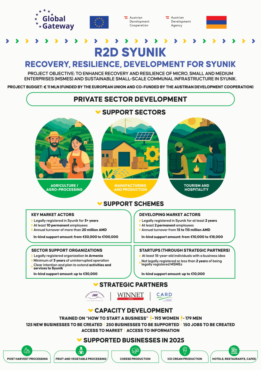 The mid and long-term goals are to ensure effective business support services and favorable framework conditions for businesses in Syunik. Given the current lack of such services and conditions, the R2D project directly provides financial and non-financial support for businesses in the short term. It also implements capacity development initiatives to bridge existing gaps while simultaneously working towards establishing services and favorable framework conditions that can be sustainably maintained by key stakeholders in Armenia.