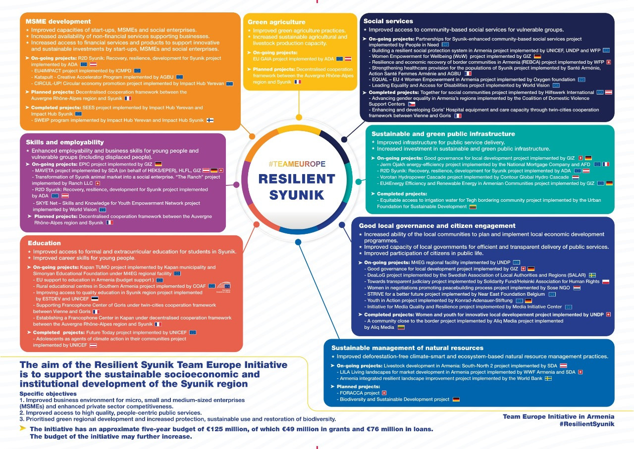 The Resilient Syunik Team Europe Initiative is the joint undertaking of the European Union, the European Investment Bank and EU Member states Austria, Czechia, Estonia, Finland, France, Germany, Lithuania, the Netherlands, Poland and Sweden, with Switzerland also joining as an external partner. The main objective of this #TeamEurope initiative is to contribute to the sustainable socioeconomic and institutional development of the Syunik region, taking coordinated action in line with the development priorities of the regional and local authorities in the Armenia-European Union flagship initiative focusing on the area. The initiative is a flexible mechanism, it may be further expanded and is open for member states to join with new initiatives to promote the development of the Syunik region.